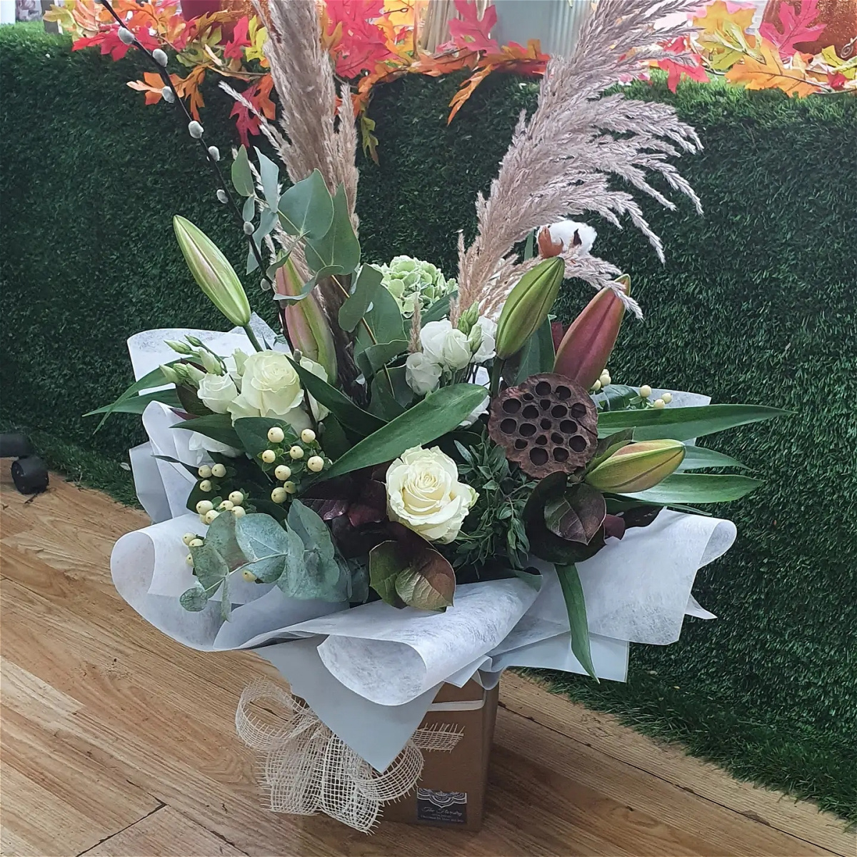 Our luxury neutral bouquet consists of a mixture of neural coloured flowers, pampus, cotton and lotus seed heads and is definitely one of our master prices.